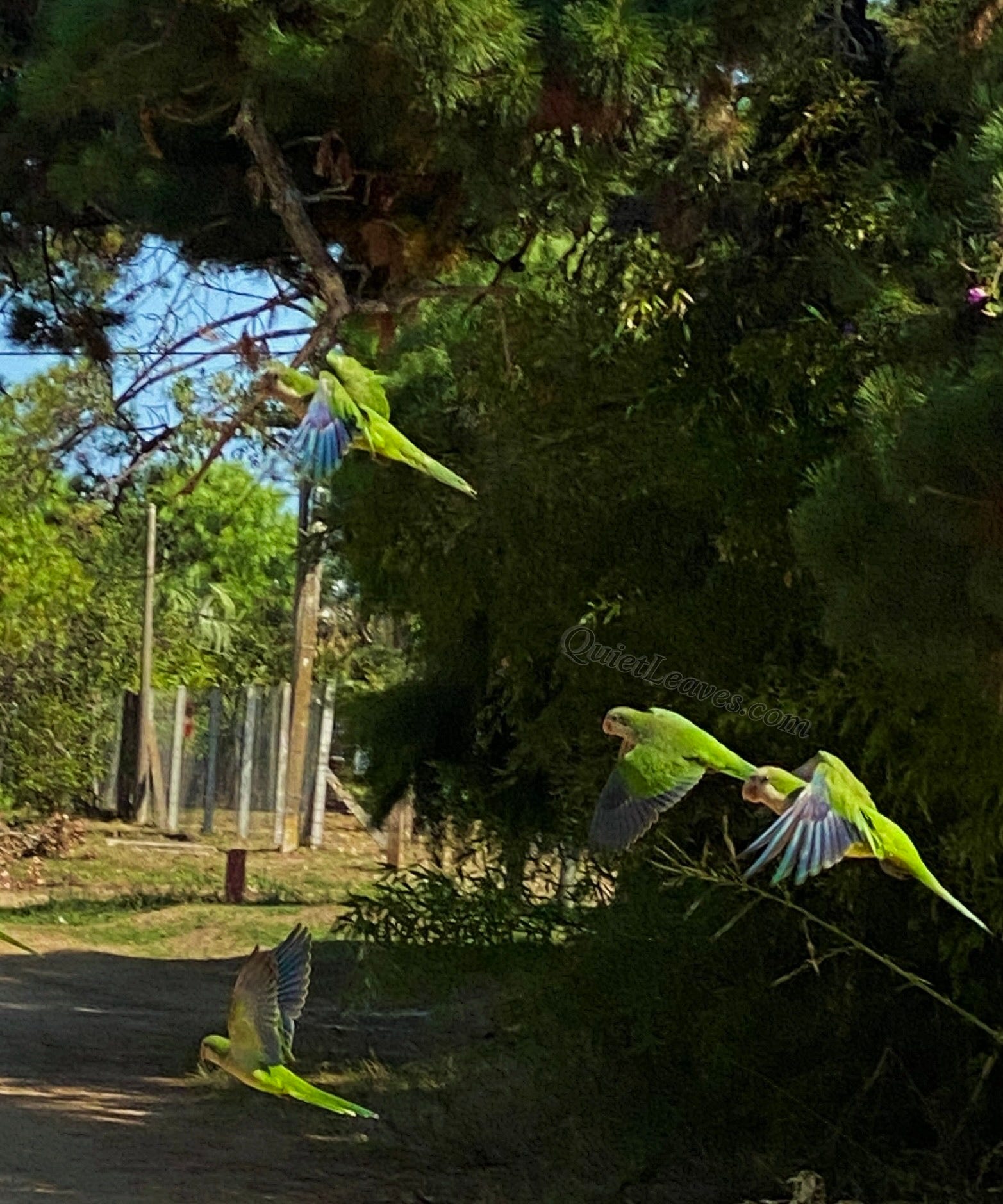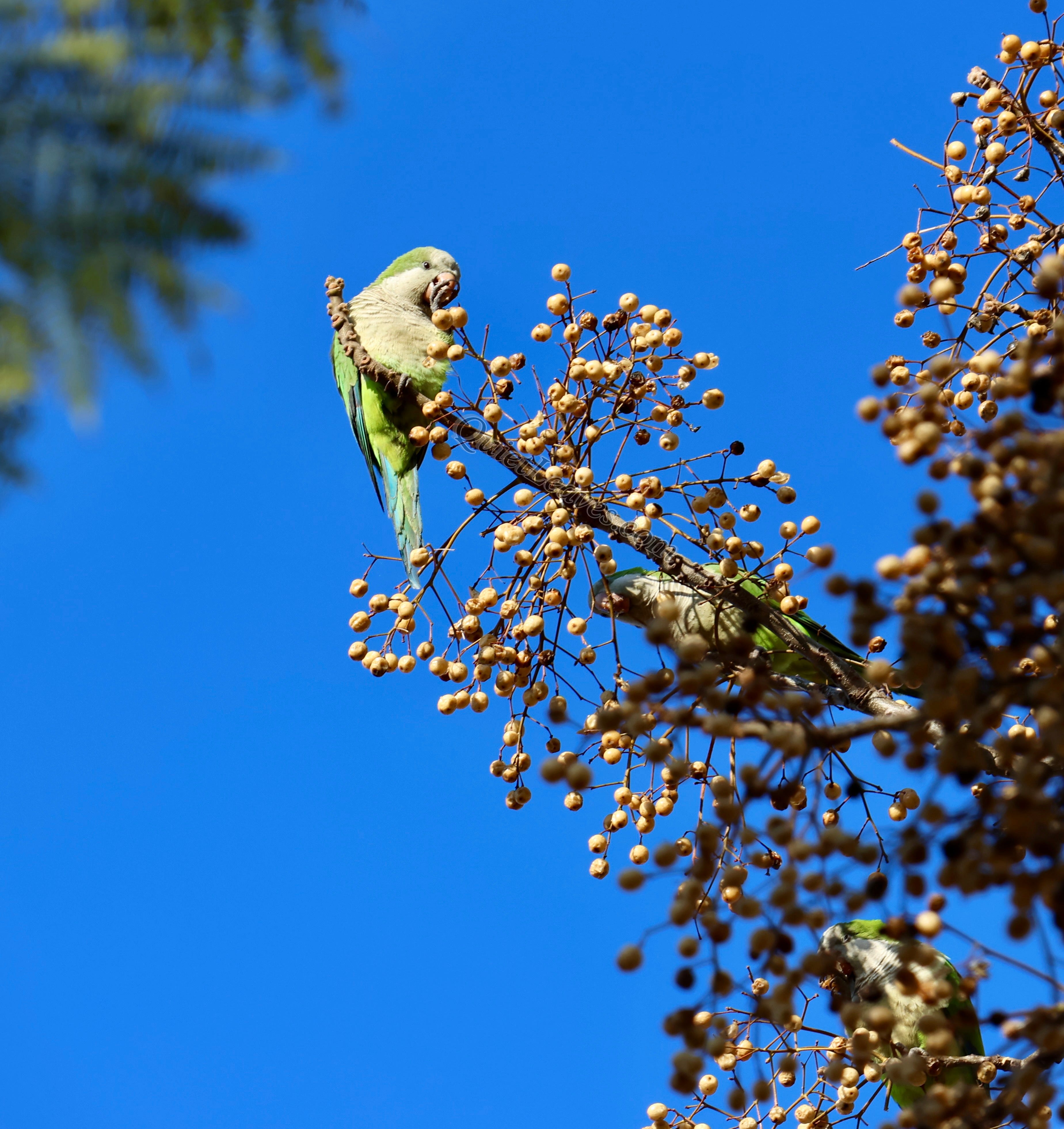 В Уругвае для них и вовсе раздолье — взять, например, бирючину и мелию. Оба дерева обильно плодоносят, и хотя на бирючину могут положить глаз и другие птицы, то на мелию претендентов практически нет. Ещё я часто вижу попугаев-монахов пирующих мушмулой, которой здесь тоже достаточно много.