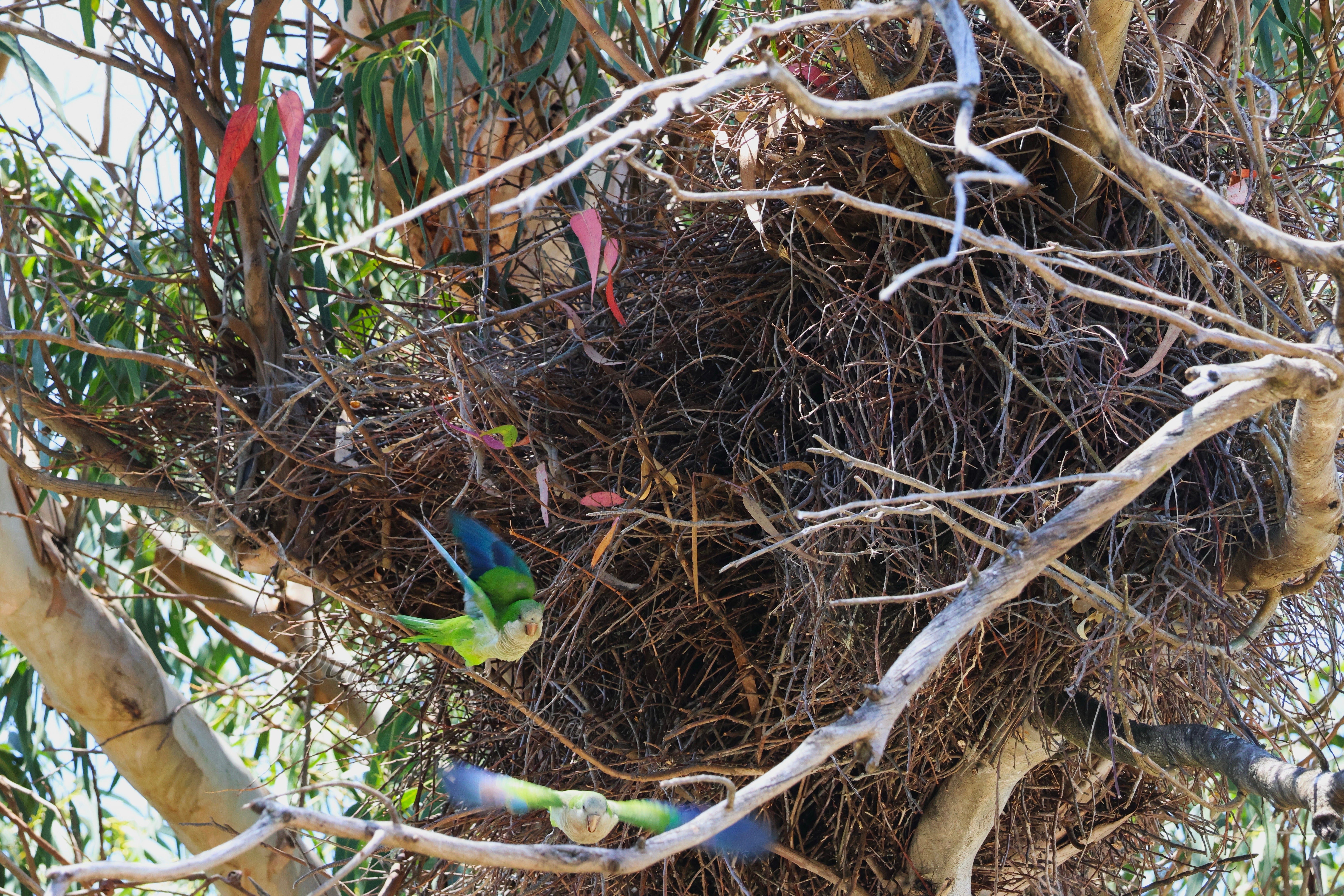 Эти зелёные крикуны предпочитают держаться группой, так что желающие принять участие в строительстве есть почти всегда. Через несколько месяцев после начала можно уже заметить обманчиво хаотичное нагромождение веток, из которого доносится нескончаемый галдёж…